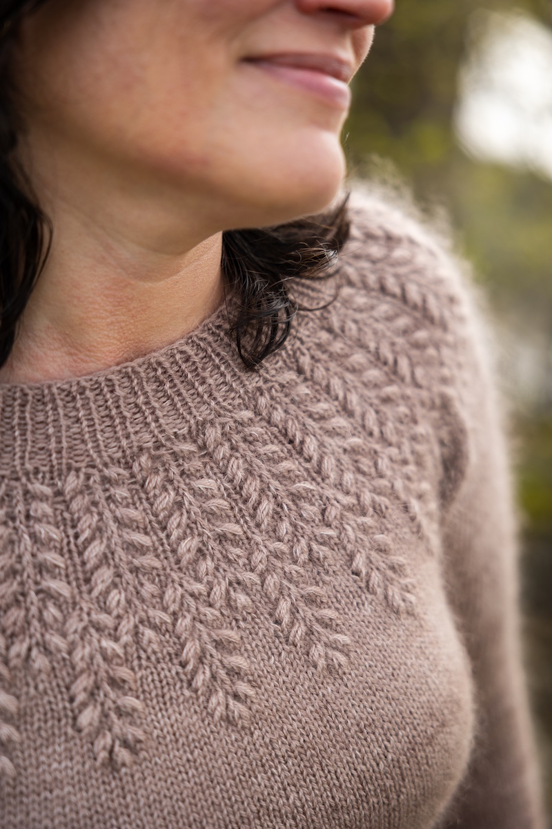 This project was chosen to highlight the combination of the light softness of SweetGeorgia Silk Mist with the wooliness of SweetGeorgia Trifecta Fine. Together they create the ultimate coziness in a sweater. Every detail is highlighted by the luminous colour and texture of the yarn.