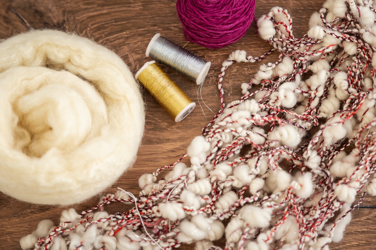 Lately, I’ve been looking for ways to expand my yarn-making repertoire and to use designer or textured yarns beyond knitting. I believe I have solved the popcorn garland problem by designing a yarn that is easy to make, looks like stringed popcorn, and lasts beyond the season.