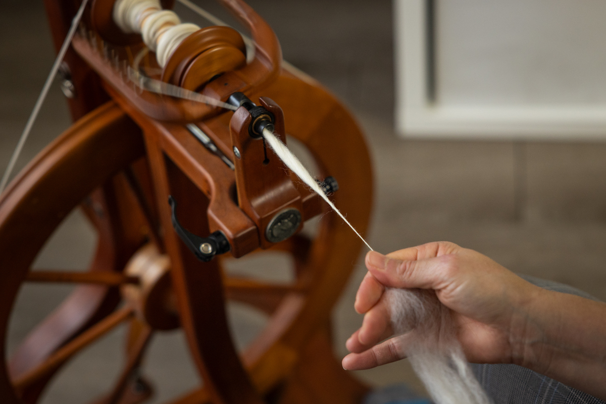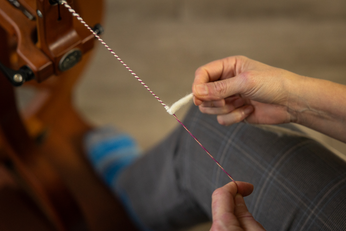 Attach your white fibre to the leader and, while spinning clockwise, spin a DK to worsted-weight yarn for about a metre.