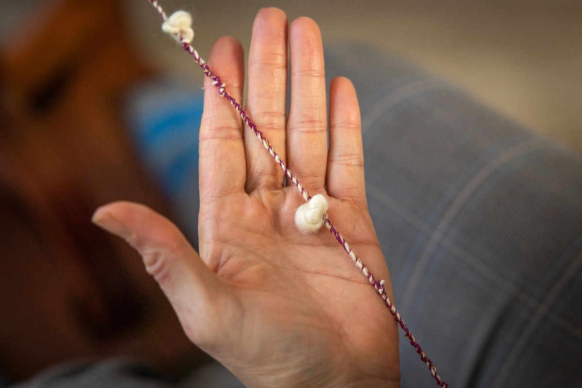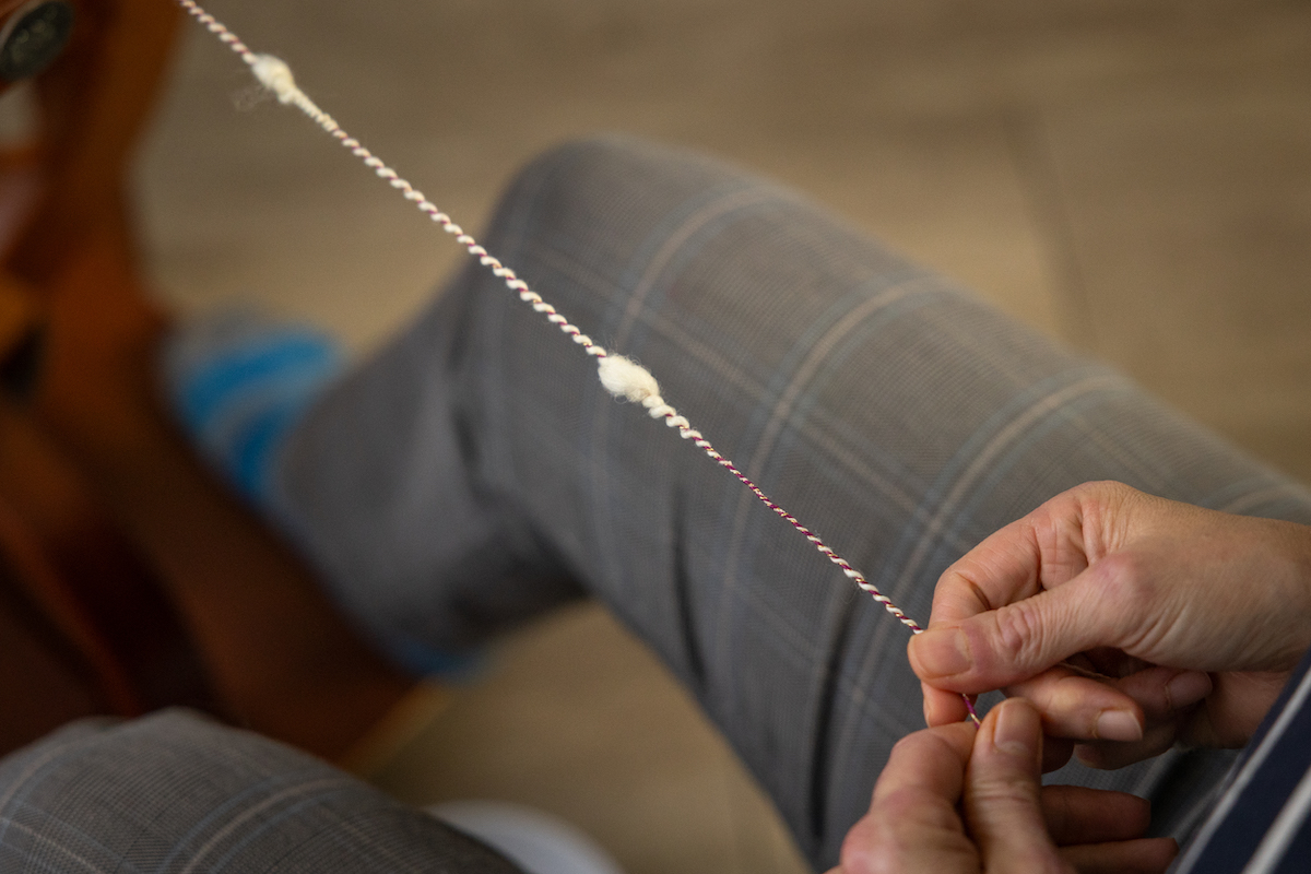 After the final pass, I wind my garland yarn onto a niddy noddy. I secure the skein using white crochet cotton and a figure-eight tie in four parts of the skein. Then I steam each section with a few blasts of my iron. Watch closely, and you can see the yarn relax into the twist with each blast. Afterwards, I let the yarn dry on the niddy noddy.