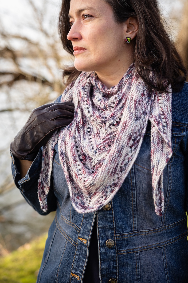 The resulting piece has a lovely blend of soft, cool tones with subtle pops of deep hues, creating a visually striking yet harmonious fabric. Perfect for layering, this shawl not only adds warmth but also serves as a stunning accessory. Knitting with the Cold Snap colourway brings out the best in both the pattern and the yarn, resulting in a piece that is both cozy and full of character.