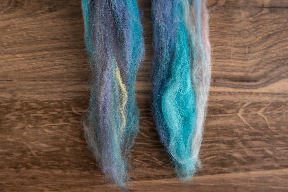 I like to pre-draft the carded fibres that I’ve chosen to corespin to add air and increase the ease of drafting. In my experience, I have found that ensuring there is no twist added to the fibre after it is prepped helps with ease in the actual corespinning itself.