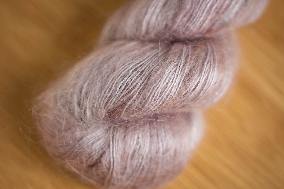 Corespinning is a technique of creating yarn that features two parts: a core and a fibre wrapping around that core. Over the years, through trial and error, I have used many core yarns to wrap fibre around. I have achieved the best results for a core yarn with a kid mohair-silk fibre blend, as well as any high-halo yarn. I suspect the reason for this is, in fact, the halo. The wrapping fibres are able to grab onto the fuzzy halo of the core yarns and, as the twist enters, the fibres easily wrap around the core and stay there. In the past, I have had fibres wrapped around core yarn move and shift, in both the finishing process and once it is knit or woven into fabric, because there wasn’t enough of a surface halo for the fibres to really lock on to.