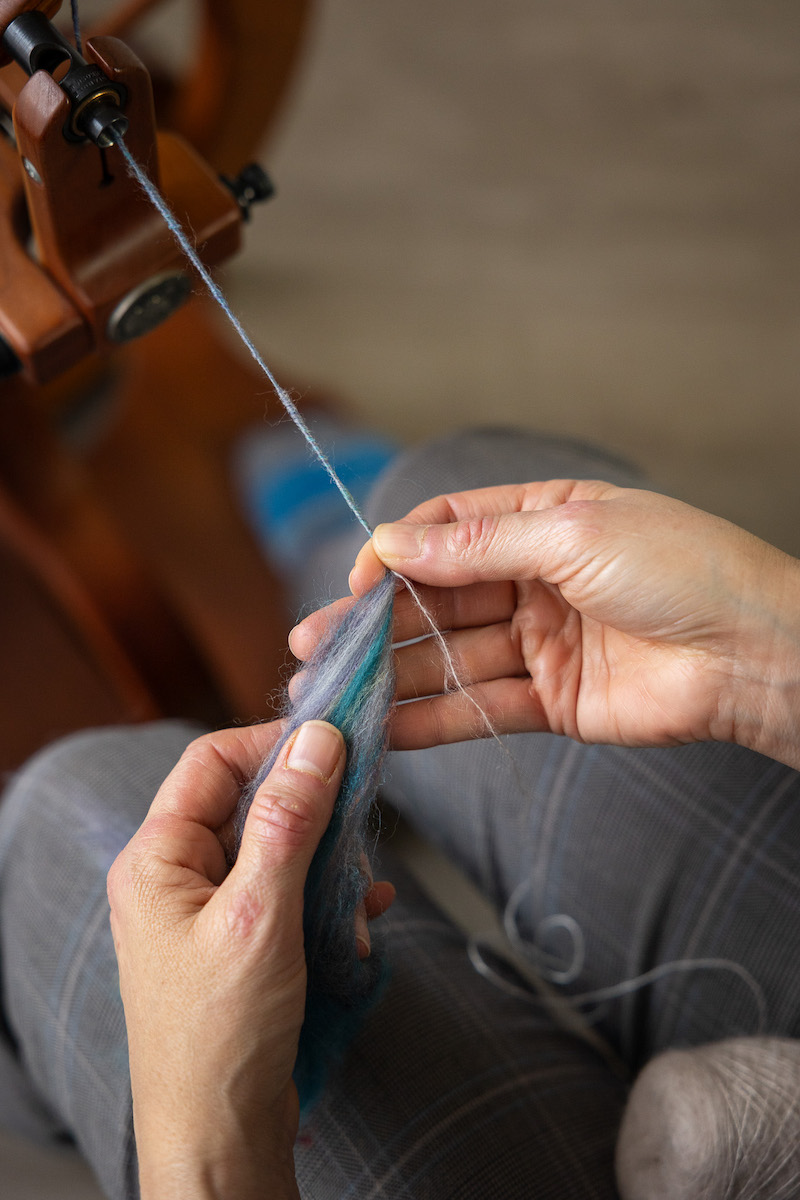 Autowrapping uses dexterity and control to ensure the thread continues to wrap as the corespun is made. This is a great skill to bring back to your conventional spinning, and will improve the dexterity of finger movements when spinning slippery or difficult-to-draft fibres.