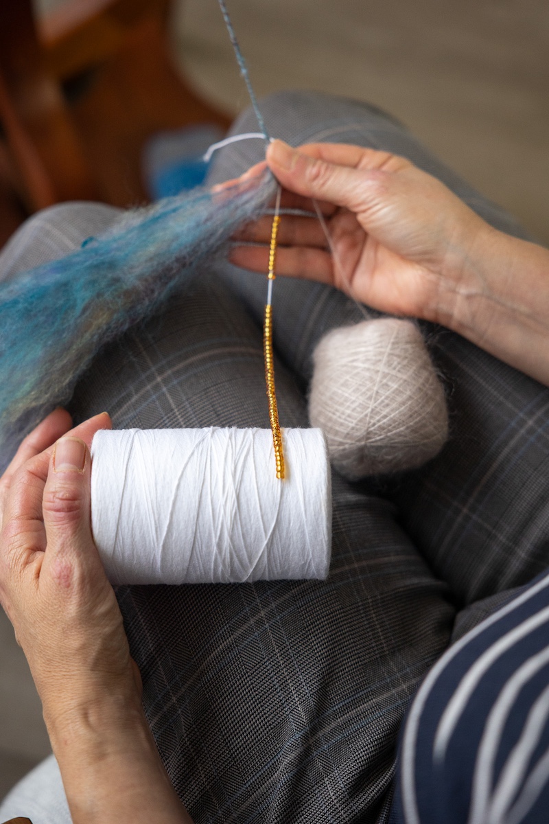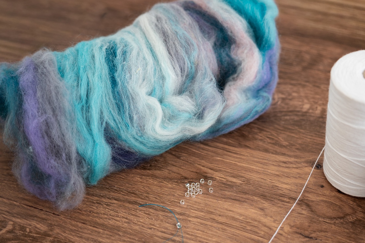 The first step is to gather materials. Recommended materials for building this yarn include: a lightweight core yarn, wool fibre, lightweight string or thread, and beads or bells. To be successful in creating this yarn, we will explore each material in depth.