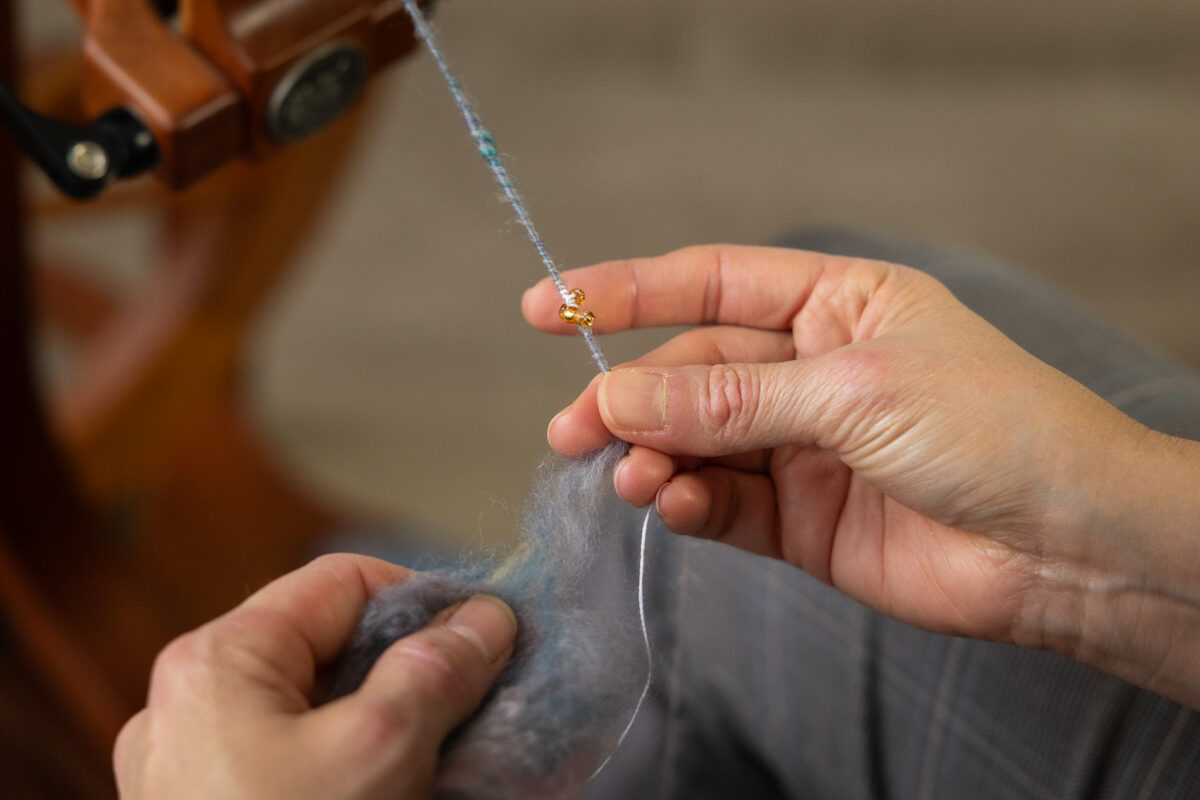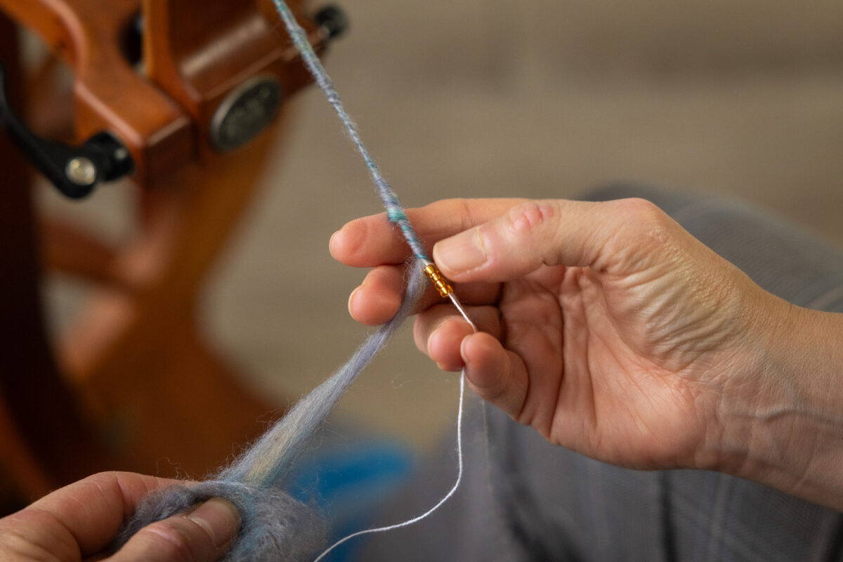 The corespinning of the wool and autowrapping of the thread with bells are done at the same time. We will begin by explaining the core spinning aspect of this yarn first.
