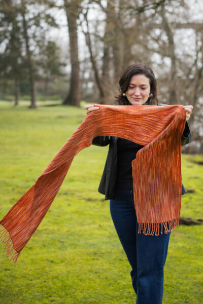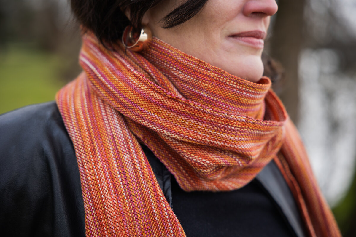 The Colour Field scarf is an excellent next step. It replaces the fingering-weight weft with a lace-weight yarn, creating an overall warp-dominant appearance. What does that mean? The warp yarn takes the lead in the finished look. The weft still plays a role by casting a subtle hue or shade over the entire project, but the movement of colour in the warp is what truly draws the eye. This structure allows special yarns to shine in the final piece, just like our Lunar New Year colourway, Fuel on the Fire!