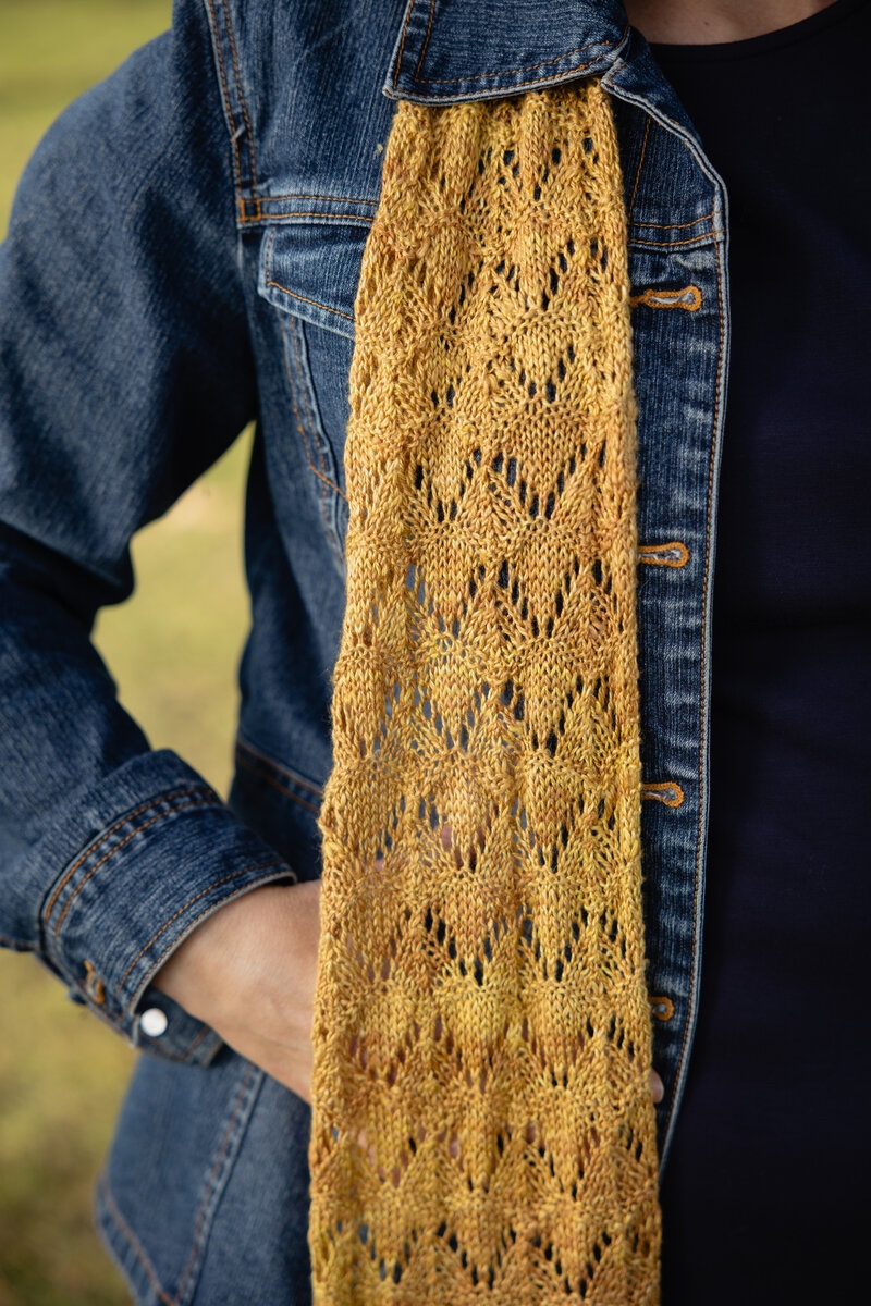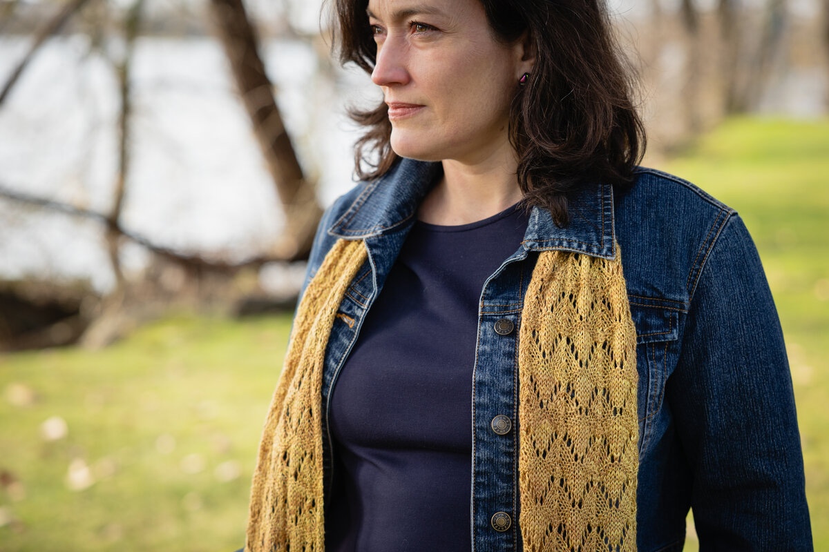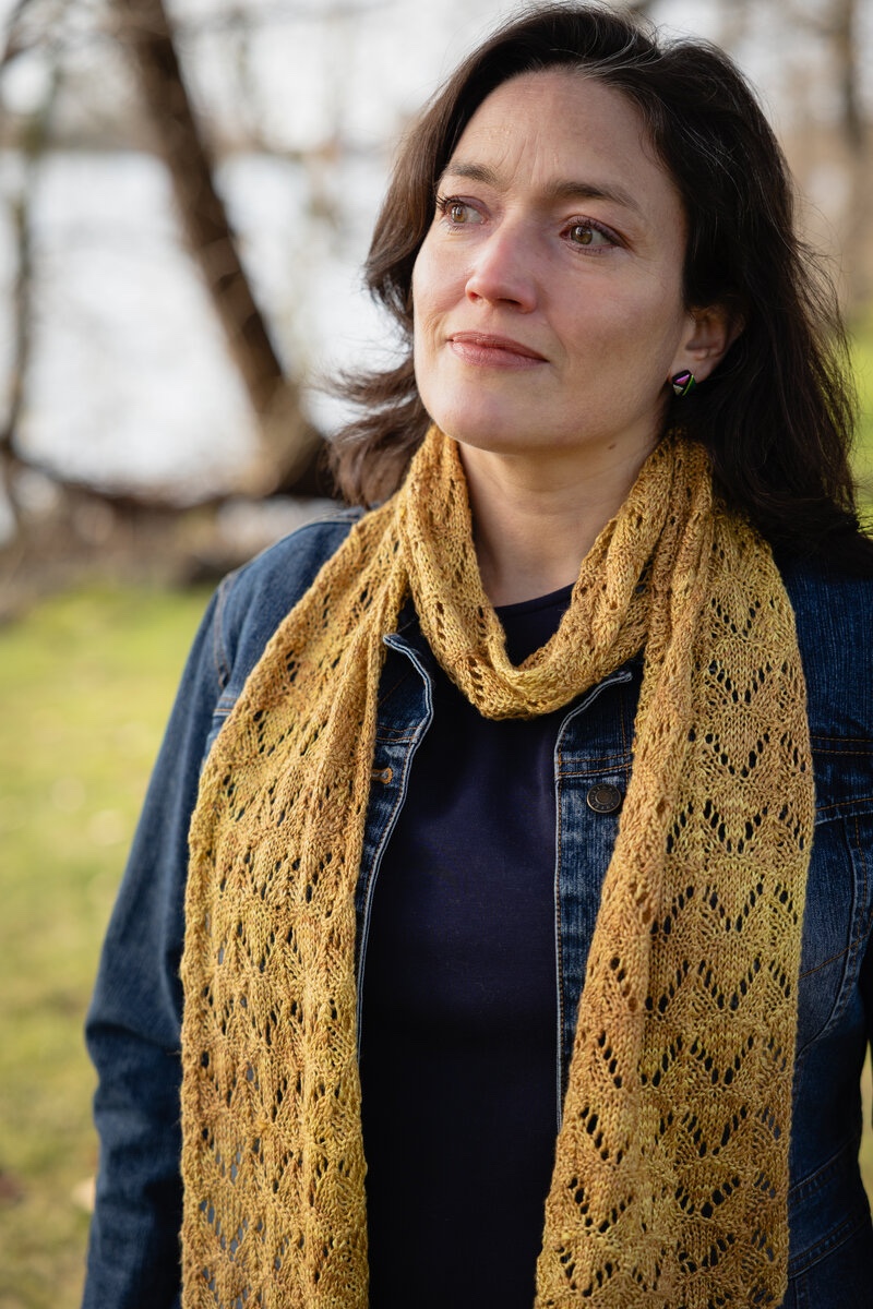 Both yarns offer beautiful drape and stitch definition, and each works wonderfully with this pattern. You can also customize the scarf to suit your personality! For a wider scarf, simply add more stitches in multiples of 10. This scarf is worked flat in two halves and then grafted together in the middle. When winding your skein, divide it in half by weight to use up as much yarn as possible for each half,