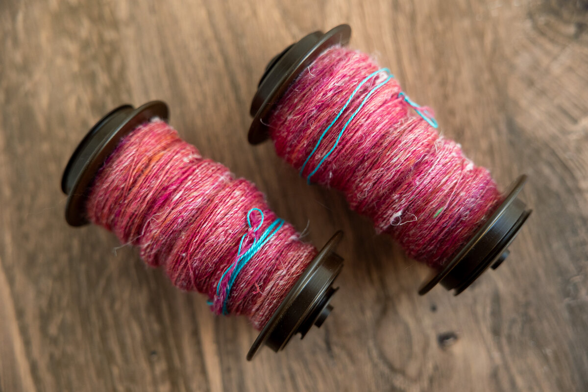 For even more inspiration, Kim inspired two incredible posts last year. In the first, Tanzanite Flax Brunch: Spin This Delicious Wool & Flax Blend Yarn, we feature the yarn she spun during the course, blending braids of fibre with flax and approaching colour and fibre in a way that really gets the imagination motivated. In the second, From Spark to Skein: Exploring Kim McKenna’s Handspun Blends, she continued to explore blends after the course, continuing to ask how else these blending ideas might evolve. That curiosity led her to spin multiple skeins using bast fibres alongside silk, angelina, and more.