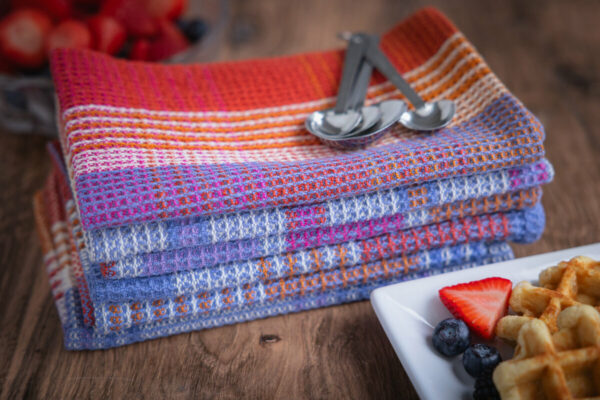 Is it the joyful play of colour, the irresistible waffle texture, or just the way they come together so effortlessly? The warp uses four main colours, woven in Maurice Brassard 8/2 Unmercerized Cotton, while up to six colours dance through the weft, creating rich and surprising combinations. (Also making this a great scrap-busting project.)